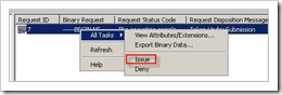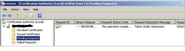 You can now submit the requests and issue the certificates. Export the certificates and and save the exported .cer file. Copy signed file back to the host where the request was created and run the following command :