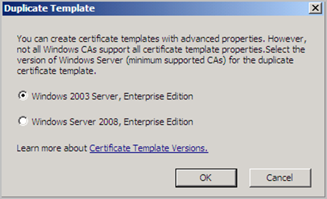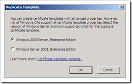 If budget permits, I would highly recommend using Windows 2008 server Enterprise edition for the issuing CA. This will allow you to create custom templates, which will provide you with much more flexibility in the end. Of course, if you don’t have budget, 2008 standard edition will work as well. Even 2003 or 2000 CA’s will work. This blog post will assume that you are using Windows 2008 server Enterprise edition. If you are using standard editions, skip everything about custom templates (see later). Keep in mind : CA running on Windows server standard edition only supports v1 templates.