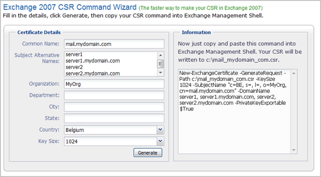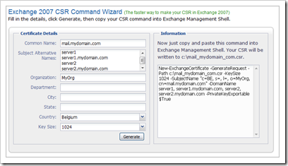 Note : since you have specified "PrivateKeyExportable:$true", you can generate/import the certificate on an Exchange 2007 server, then export it (export private key as well) and then import the entire key onto another webserver. So if you set the parameters right, you will have maximum flexibility.