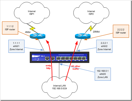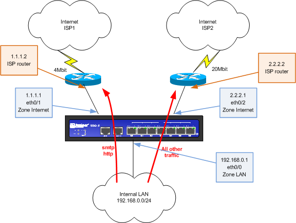 Goal : use the reliable connection for smtp traffic (1Mbit) and http traffic (3Mbit), and route all other internet traffic over the other connection