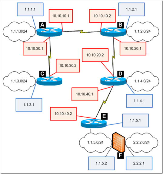 So we have 6 networks , 5 routers/Juniper firewalls that are OSPF capable (routers A, B, C, D and E), and 1 legacy firewall (F) that is not capable of running OSPF.