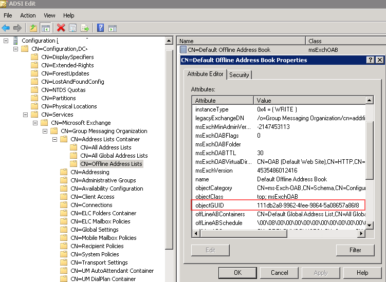 Open adsiedit.msc, open “Configuration”, and drill down to CN=Services, CN=Microsoft Exchange, CN=Messaging Organization, CN=Address Lists Containers, CN=Offline Address Lists