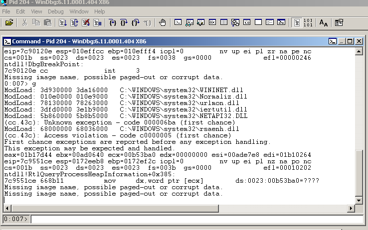 0:007> k ChildEBP RetAddr 0172ef2c 7c9556d9 ntdll!RtlQueryProcessHeapInformation+0x385 0172ef88 7c864c5e ntdll!RtlQueryProcessDebugInformation+0x1ee 0172efac 01837d93 kernel32!Heap32First+0x48 WARNING: Frame IP not in any known module. Following frames may be wrong. 0172f874 7c8024c7+0x1837d92 0172f878 00000000 kernel32!ReleaseMutex+0x10