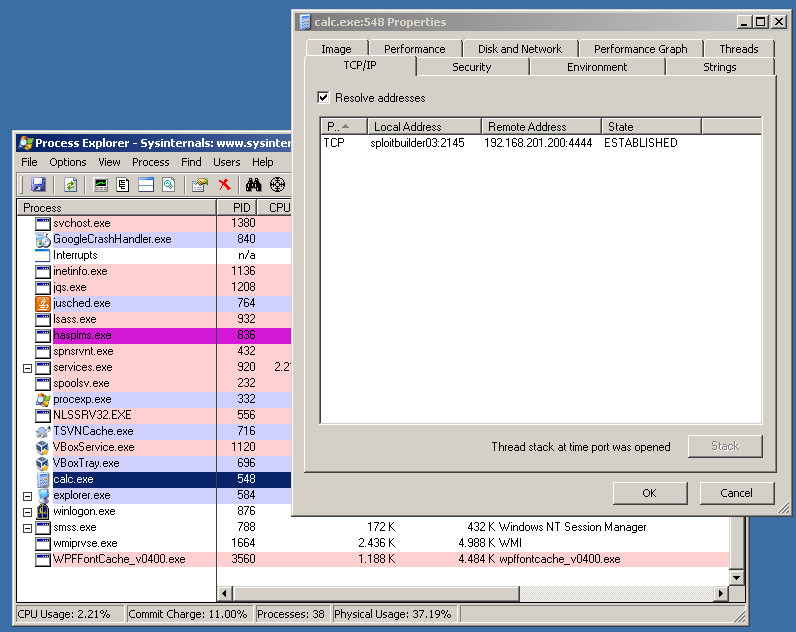 After the call to CreateProcess(), a new childprocess “calc” is found running. In order to allow the process to properly initialize, the call is followed by kernel32.Sleep(3000), basically allowing calc.exe to initialize for 3 seconds. This is a bit “ugly”… a call to WaitForInputIdle() would have been better, but that API is not part of kernel32 (and loading user32.dll would only make the shellcode larger). Furthermore, the process we are spawning (calc.exe) is small and fast. Simply waiting for 3 seconds should never be an issue.