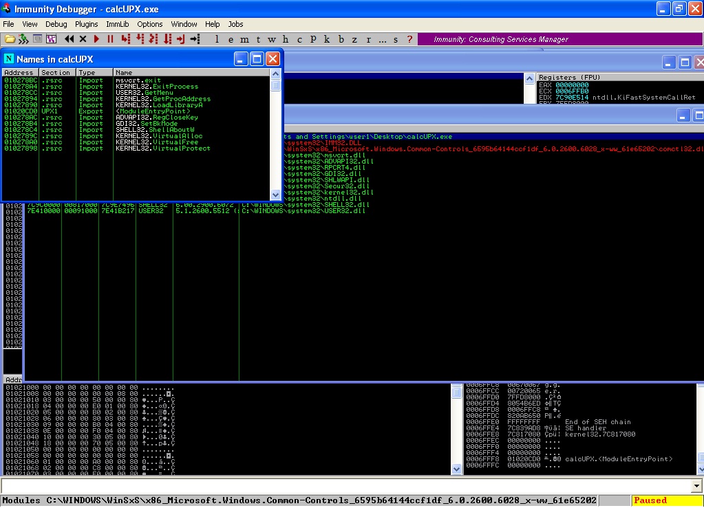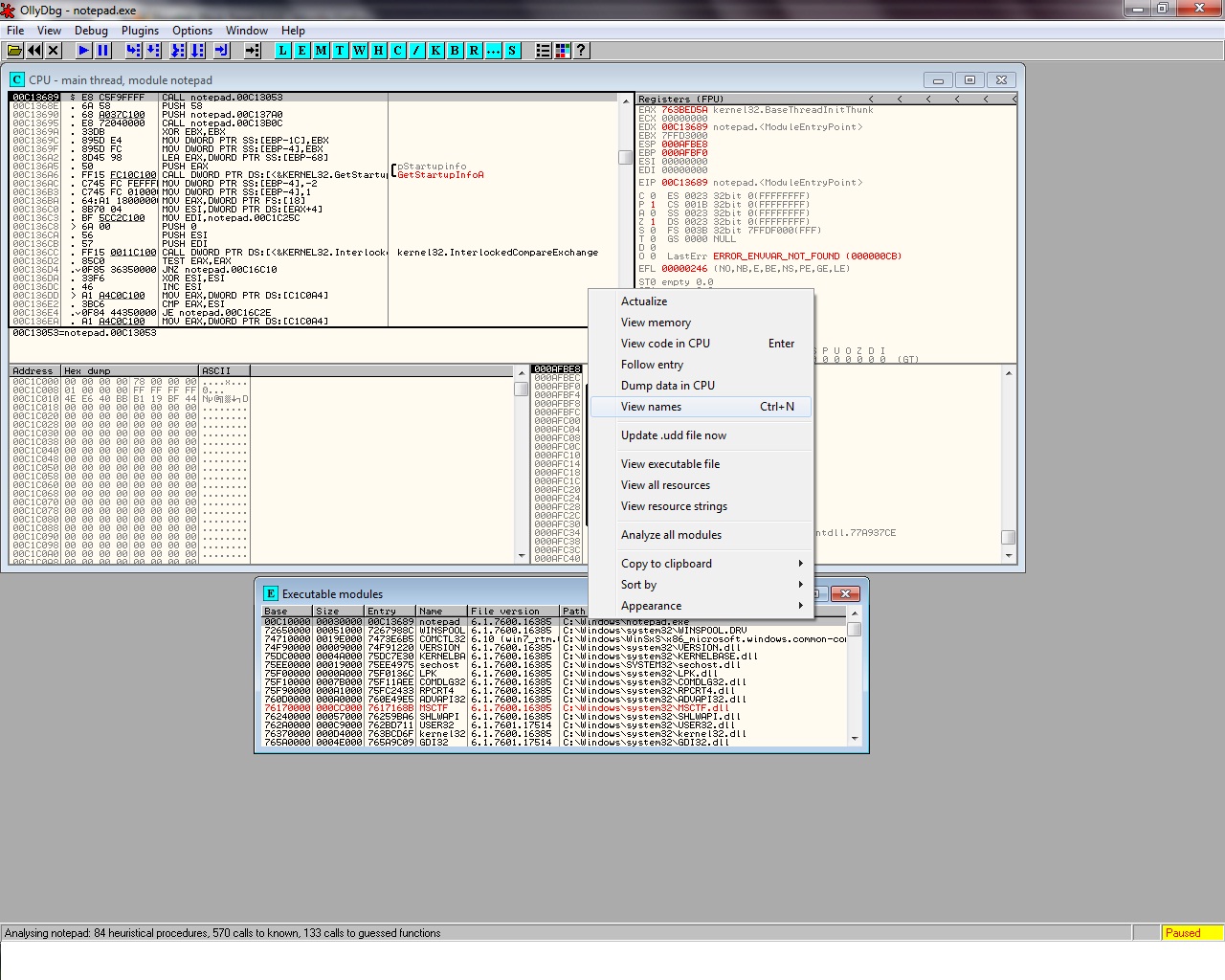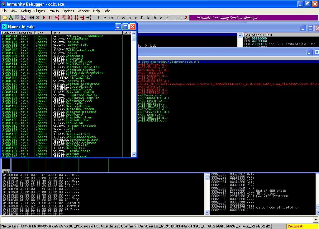 Names in notepad Address Section Type ( Name Comment 00C113D4 .text Import OLEAUT32.#2 00C113C8 .text Import COMCTL32.#345 00C113D0 .text Import OLEAUT32.#6 00C11178 .text Import ( GDI32.AbortDoc 00C11310 .text Import msvcrt._acmdln 00C11308 .text Import msvcrt._amsg_exit 00C11324 .text Import ( msvcrt._cexit 00C11238 .text Import ( USER32.CharNextW 00C111CC .text Import ( USER32.CharUpperW 00C1123C .text Import ( USER32.CheckMenuItem 00C11274 .text Import ( USER32.ChildWindowFromPoint 00C11348 .text Import ( COMDLG32.ChooseFontW 00C11240 .text Import ( USER32.CloseClipboard 00C1112C .text Import ( KERNEL32.CloseHandle 00C11388 .text Import WINSPOOL.ClosePrinter 00C11018 .text Import ADVAPI32.CloseServiceHandle 00C113A0 .text Import ole32.CoCreateInstance 00C113A8 .text Import ole32.CoInitialize 00C11394 .text Import ole32.CoInitializeEx 00C11350 .text Import ( COMDLG32.CommDlgExtendedError ... <snip> ... 00C112F4 .text Import ( msvcrt.wcsrchr 00C110A8 .text Import ( KERNEL32.WideCharToMultiByte 00C1126C .text Import ( USER32.WinHelpW 00C113E8 .text Import ntdll.WinSqmAddToStream 00C113DC .text Import ntdll.WinSqmIncrementDWORD 00C1106C .text Import KERNEL32.Wow64DisableWow64FsRedirectio 00C11068 .text Import KERNEL32.Wow64RevertWow64FsRedirection 00C110B0 .text Import ( KERNEL32.WriteFile 00C112E4 .text Import ( msvcrt._wtol 00C1131C .text Import msvcrt._XcptFilter