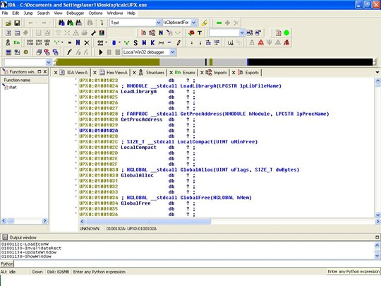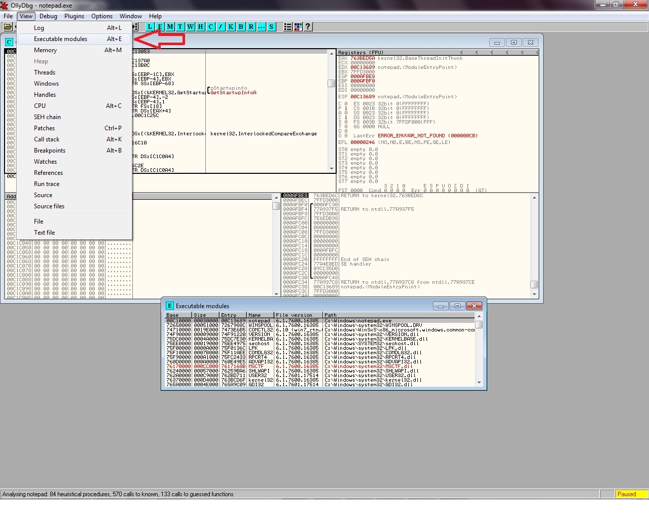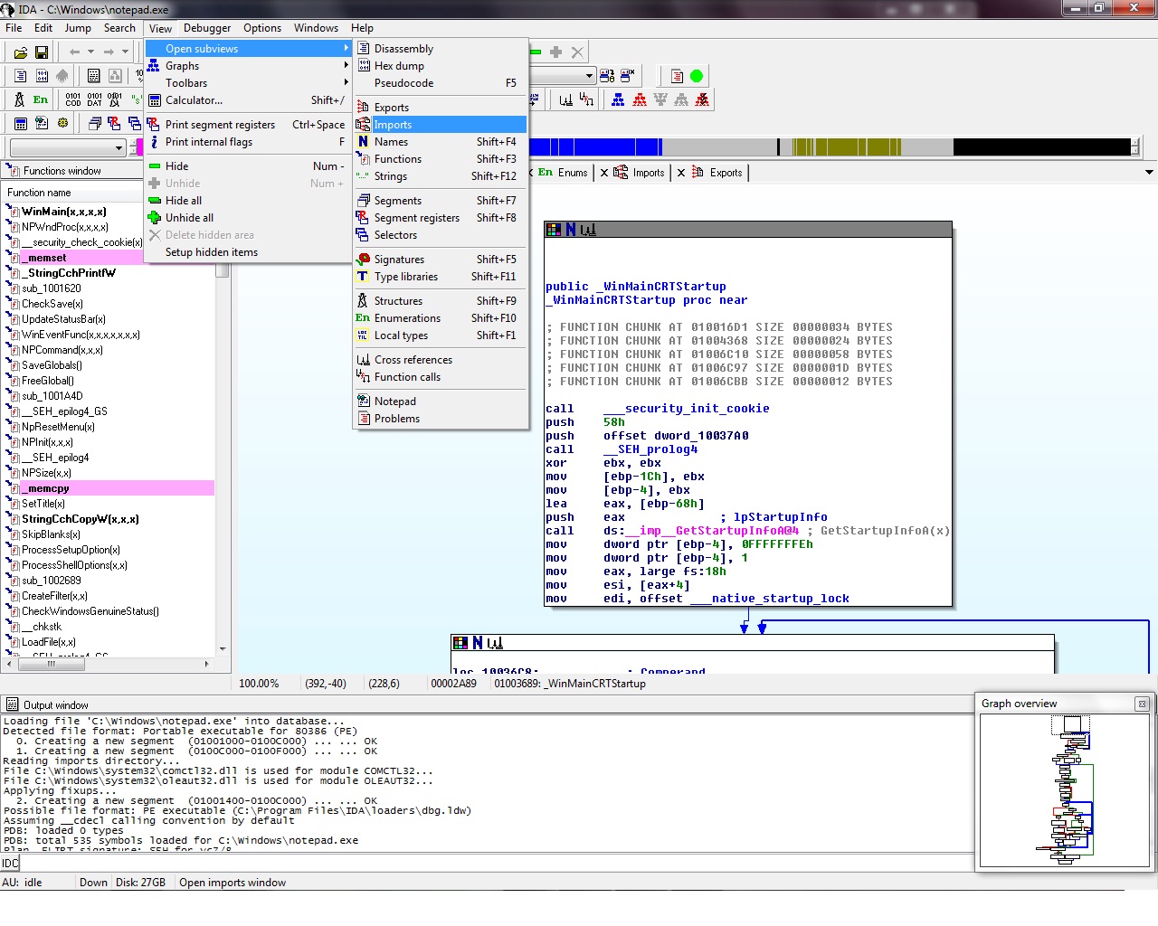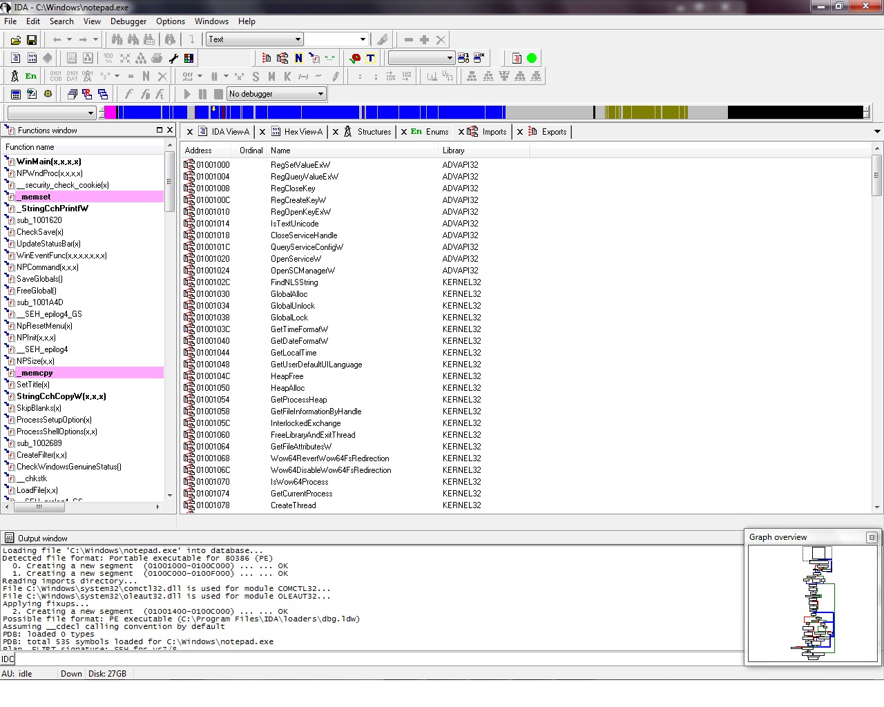 Names in notepad Address Section Type ( Name Comment 00C113D4 .text Import OLEAUT32.#2 00C113C8 .text Import COMCTL32.#345 00C113D0 .text Import OLEAUT32.#6 00C11178 .text Import ( GDI32.AbortDoc 00C11310 .text Import msvcrt._acmdln 00C11308 .text Import msvcrt._amsg_exit 00C11324 .text Import ( msvcrt._cexit 00C11238 .text Import ( USER32.CharNextW 00C111CC .text Import ( USER32.CharUpperW 00C1123C .text Import ( USER32.CheckMenuItem 00C11274 .text Import ( USER32.ChildWindowFromPoint 00C11348 .text Import ( COMDLG32.ChooseFontW 00C11240 .text Import ( USER32.CloseClipboard 00C1112C .text Import ( KERNEL32.CloseHandle 00C11388 .text Import WINSPOOL.ClosePrinter 00C11018 .text Import ADVAPI32.CloseServiceHandle 00C113A0 .text Import ole32.CoCreateInstance 00C113A8 .text Import ole32.CoInitialize 00C11394 .text Import ole32.CoInitializeEx 00C11350 .text Import ( COMDLG32.CommDlgExtendedError ... <snip> ... 00C112F4 .text Import ( msvcrt.wcsrchr 00C110A8 .text Import ( KERNEL32.WideCharToMultiByte 00C1126C .text Import ( USER32.WinHelpW 00C113E8 .text Import ntdll.WinSqmAddToStream 00C113DC .text Import ntdll.WinSqmIncrementDWORD 00C1106C .text Import KERNEL32.Wow64DisableWow64FsRedirectio 00C11068 .text Import KERNEL32.Wow64RevertWow64FsRedirection 00C110B0 .text Import ( KERNEL32.WriteFile 00C112E4 .text Import ( msvcrt._wtol 00C1131C .text Import msvcrt._XcptFilter