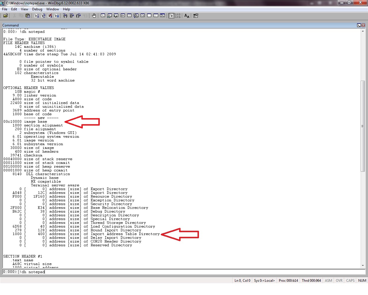 As opposed to the other two debuggers, windbg lacks the easy drop down menu commands and identifying IAT requires a bit more time. First we need to locate the address of the Import Address Table in our executable, to do so the command !dh will be used:
