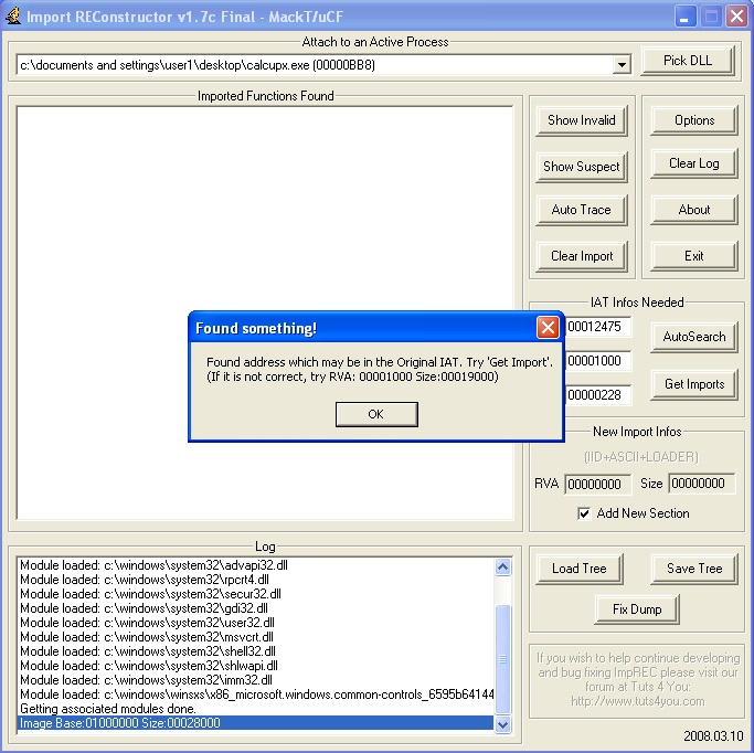 If you take that address (the offset from the base address of the module), example “JMP To Address:01012475 – Image Base:01000000 = 12475” , in the OEP section of the ImpRE, and press AutoSearch, our imported functions will be populated.