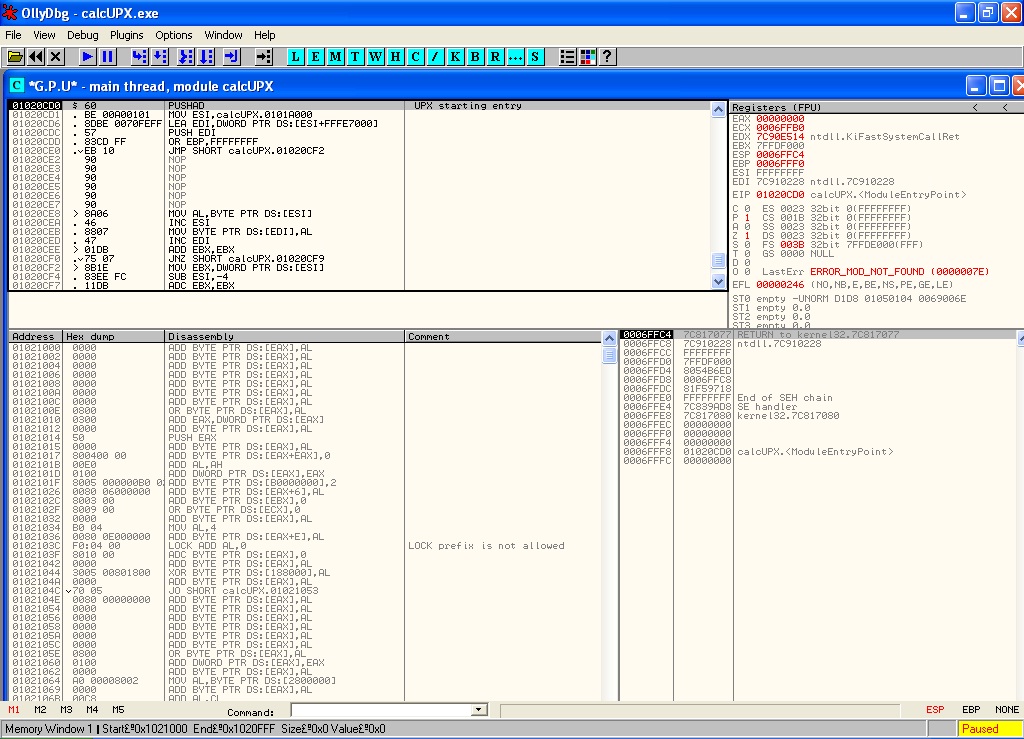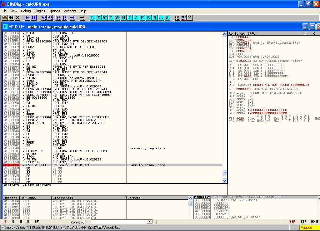 So, if we want to manually unpack the UPX packed file and re-building the IAT we have to find the actual OEP ( original entry point ) of our code. This is where the “decoder/decryptor/unpacker” routine is located.