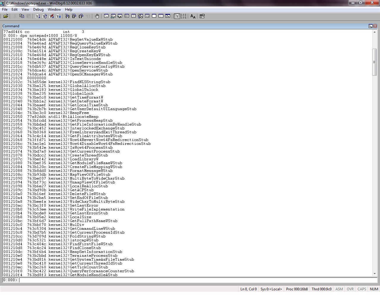 0:000> $$>a< test1.txt notepad 00121000 760e14d6 ADVAPI32!RegSetValueExWStub 00121004 760e46ad ADVAPI32!RegQueryValueExWStub 00121008 760e469d ADVAPI32!RegCloseKeyStub 0012100c 760e1514 ADVAPI32!RegCreateKeyW 00121010 760e468d ADVAPI32!RegOpenKeyExWStub 00121014 760e448e ADVAPI32!IsTextUnicode 00121018 760e369c ADVAPI32!CloseServiceHandleStub 0012101c 760db537 ADVAPI32!QueryServiceConfigWStub 00121020 760dca4c ADVAPI32!OpenServiceWStub 00121024 760dca64 ADVAPI32!OpenSCManagerWStub 00121028 00000000 0012102c 763d55de kernel32!FindNLSStringStub 00121030 763ba125 kernel32!GlobalAllocStub 00121034 763ba183 kernel32!GlobalUnlock 00121038 763ba235 kernel32!GlobalLock 0012103c 763bafc0 kernel32!GetTimeFormatW 00121040 763bb1a2 kernel32!GetDateFormatW 00121044 763baaef kernel32!GetLocalTimeStub 00121048 763b2b7b kernel32!GetUserDefaultUILanguageStub 0012104c 763bc3c0 kernel32!HeapFree 00121050 77a82dd6 ntdll!RtlAllocateHeap 00121054 763bfcdd kernel32!GetProcessHeapStub 00121058 763bbdad kernel32!GetFileInformationByHandleStub 0012105c 763bc452 kernel32!InterlockedExchangeStub 00121060 763b0368 kernel32!FreeLibraryAndExitThreadStub 00121064 763c4c14 kernel32!GetFileAttributesWStub 00121068 763ffd71 kernel32!Wow64RevertWow64FsRedirectionStub ... <snip> ... 001213e0 77a64168 ntdll!RtlInitUnicodeString 001213e4 77a760f8 ntdll!NtQueryLicenseValue 001213e8 77a504a5 ntdll!WinSqmAddToStream 001213ec 00000000 001213f0 74f91a15 VERSION!GetFileVersionInfoExW 001213f4 74f918e9 VERSION!GetFileVersionInfoSizeExW 001213f8 74f91b51 VERSION!VerQueryValueW 001213fc 00000000 00121400 90909090