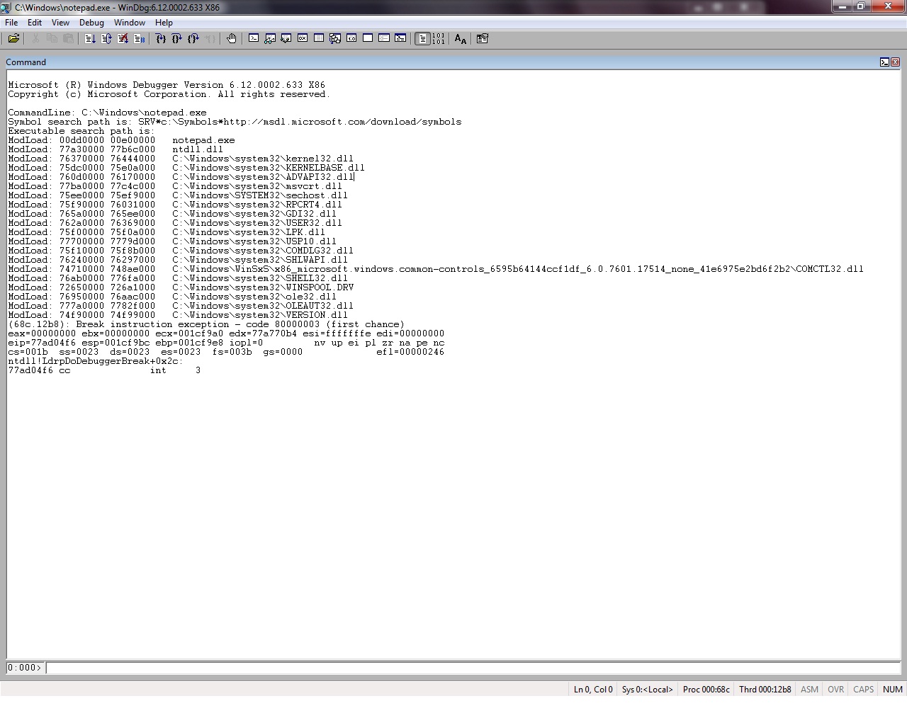windbg will load the modules and it will stop just before the execution of the program waiting for command. All modules loaded at this moment can be viewed in the screen.