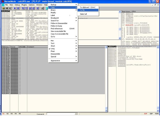 In order to get a copy of the unpacked code in memory, we can simply right click in the ollydbg main window and select “Dump debugged process”
