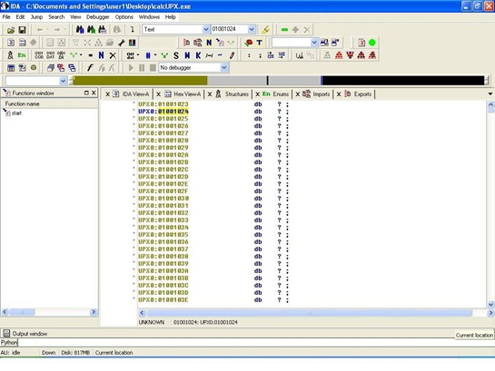 Fire up IDA and open the same packed executable. Obviously, since it’s packed, we’re not going to see any references to functions names .